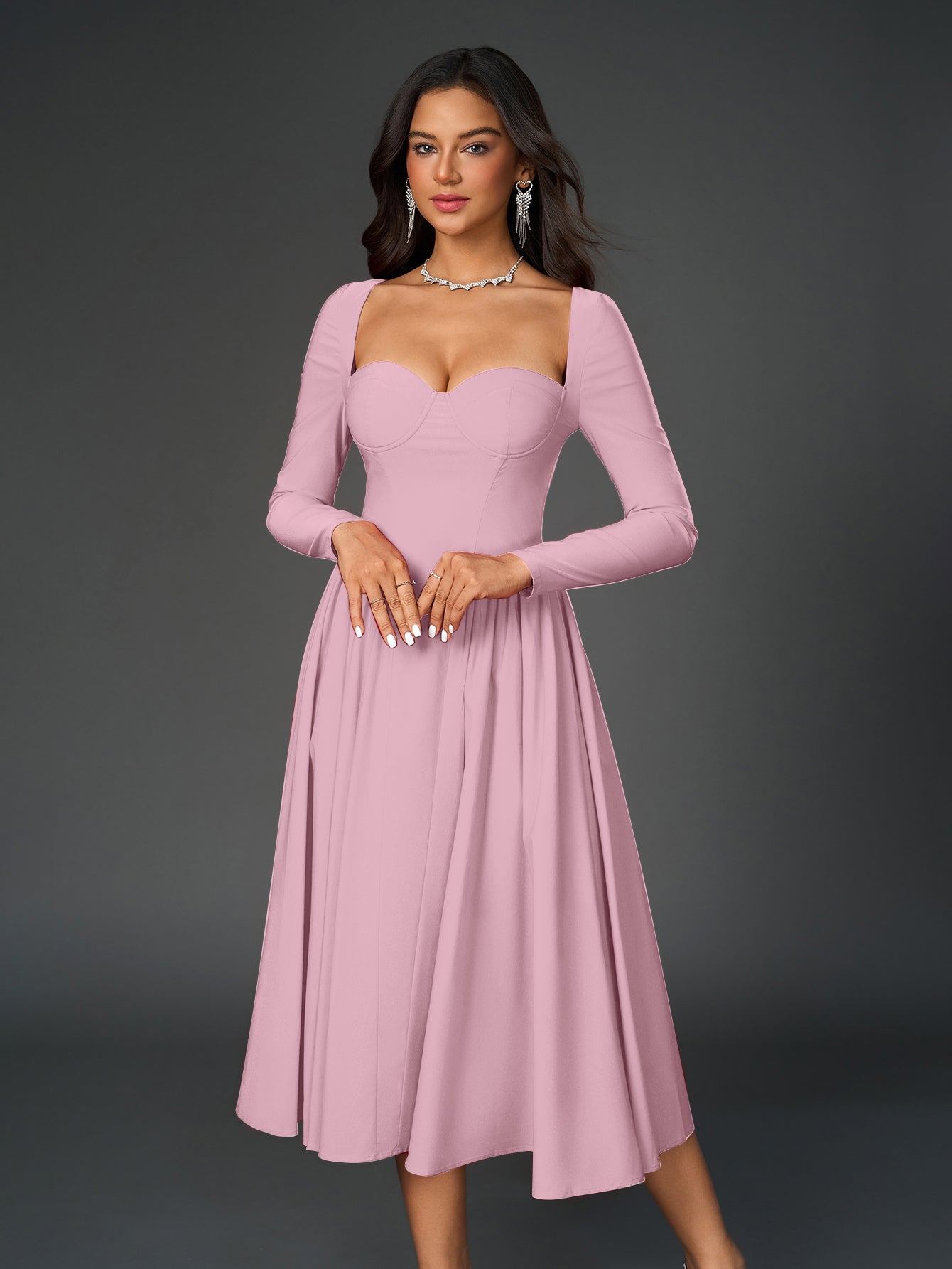 Make an unforgettable impression with this beautifully tailored long sleeve maxi dress, designed to combine structure and softness in perfect harmony. With its romantic sweetheart neckline, elegant ruched details, and a flattering tie-back design, this piece effortlessly defines your silhouette while allowing movement and ease.